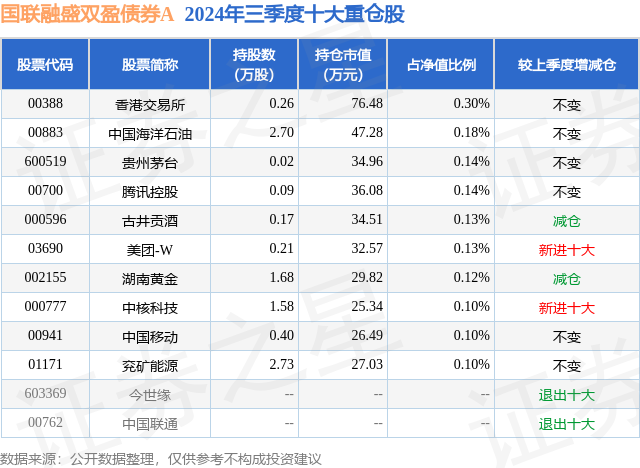 从基金规模来看,国联融盛双盈债券A基金2024年三季度公布的基金规模为0.53亿元,较上一期规模1.02亿元变化了-4907.25万元,环比变化了-48.3%。该基金最新一期资产配置为:股票占净值比3.78%,债券占净值比23.41%,现金占净值比4.78%。从基金持仓来看,该基金当季前十大股票仓位达1.44%,第一大重仓股为香港交易所(00388),持仓占比为0.3%。
