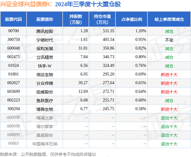 从基金规模来看,兴证全球兴益债券C基金2024年三季度公布的基金规模为2.67亿元,较上一期规模3.6亿元变化了-9274.88万元,环比变化了-25.8%。该基金最新一期资产配置为:股票占净值比13.68%,债券占净值比94.85%,现金占净值比3.04%。从基金持仓来看,该基金当季前十大股票仓位达7.69%,第一大重仓股为腾讯控股(00700),持仓占比为1.2%。