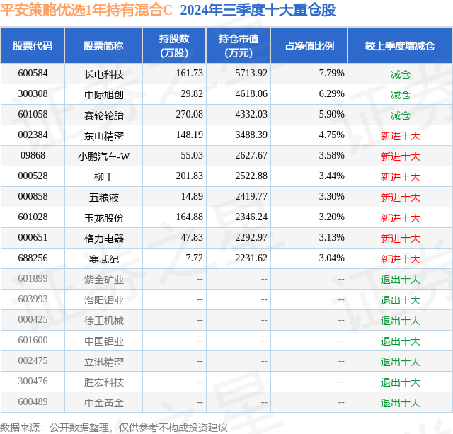 从基金规模来看,平安策略优选1年持有混合C基金2024年三季度公布的基金规模为4.34亿元,较上一期规模4.55亿元变化了-2176.52万元,环比变化了-4.78%。该基金最新一期资产配置为:股票占净值比89.66%,债券占净值比3.3%,现金占净值比8.78%。从基金持仓来看,该基金当季前十大股票仓位达44.42%,第一大重仓股为长电科技(600584),持仓占比为7.79%。