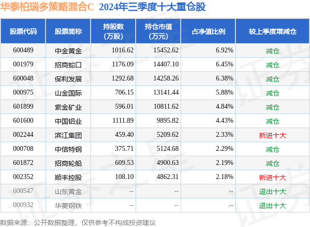 从基金规模来看,华泰柏瑞多策略混合C基金2024年三季度公布的基金规模为9.07亿元,较上一期规模8.27亿元变化了8044.12万元,环比变化了9.73%。该基金最新一期资产配置为:股票占净值比93.25%,无债券类资产,现金占净值比6.35%。从基金持仓来看,该基金当季前十大股票仓位达43.89%,第一大重仓股为中金黄金(600489),持仓占比为6.92%。