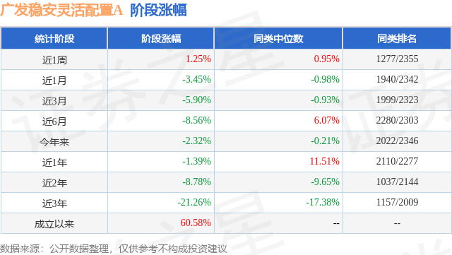 从业绩表现来看,广发稳安灵活配置A基金过去一年净值涨幅为-6.7%,在同类基金中排名2047/2261,同类基金过去一年净值涨幅中位数为5.1%。而基金过去一年的最大回撤为-17.07%,成立以来的最大回撤为-35.34%。