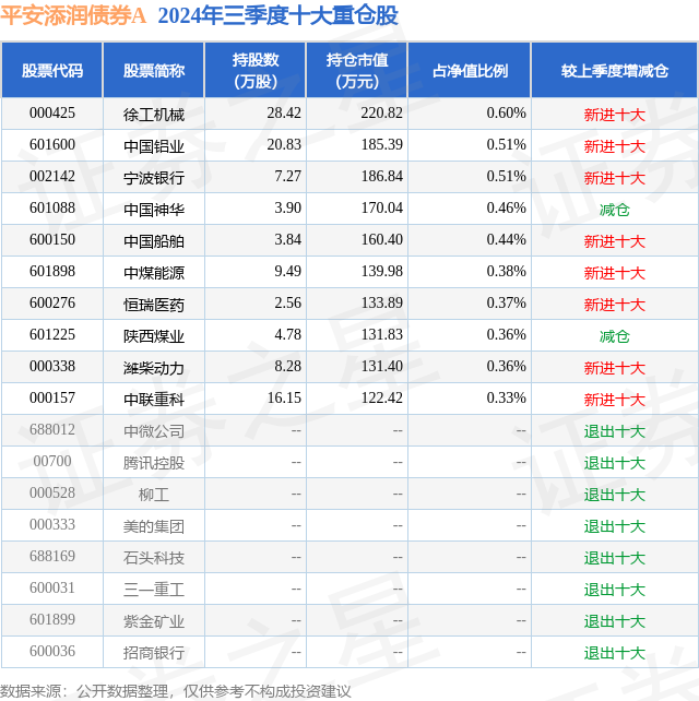 从基金规模来看,平安添润债券A基金2024年三季度公布的基金规模为1.27亿元,较上一期规模1.31亿元变化了-373.75万元,环比变化了-2.86%。该基金最新一期资产配置为:股票占净值比11.05%,债券占净值比65.87%,现金占净值比3.95%。从基金持仓来看,该基金当季前十大股票仓位达4.32%,第一大重仓股为徐工机械(000425),持仓占比为0.6%。