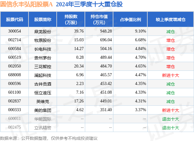 从基金规模来看,圆信永丰弘阳股票A基金2024年三季度公布的基金规模为1.04亿元,较上一期规模1.04亿元变化了66.76万元,环比变化了0.64%。该基金最新一期资产配置为:股票占净值比87.27%,债券占净值比5.33%,现金占净值比2.24%。从基金持仓来看,该基金当季前十大股票仓位达50.8%,第一大重仓股为鼎龙股份(300054),持仓占比为9.1%。
