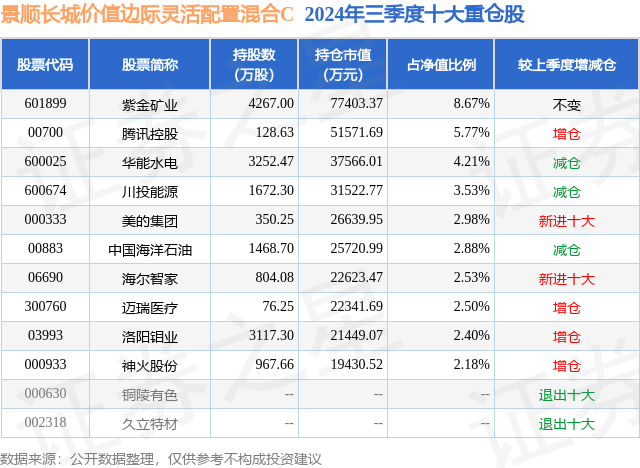 从基金规模来看,景顺长城价值边际灵活配置混合C基金2024年三季度公布的基金规模为42.14亿元,较上一期规模48.55亿元变化了-6.42亿元,环比变化了-13.22%。该基金最新一期资产配置为:股票占净值比59.0%,无债券类资产,现金占净值比8.16%。从基金持仓来看,该基金当季前十大股票仓位达37.65%,第一大重仓股为紫金矿业(601899),持仓占比为8.67%。