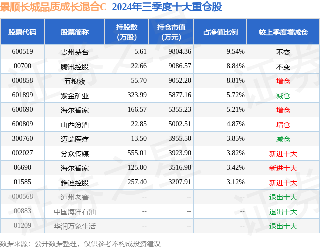 从基金规模来看,景顺长城品质成长混合C基金2024年三季度公布的基金规模为0.01亿元,较上一期规模1378.47万元变化了-1274.16万元,环比变化了-92.43%。该基金最新一期资产配置为:股票占净值比91.09%,债券占净值比2.92%,现金占净值比5.92%。从基金持仓来看,该基金当季前十大股票仓位达57.2%,第一大重仓股为贵州茅台(600519),持仓占比为9.54%。