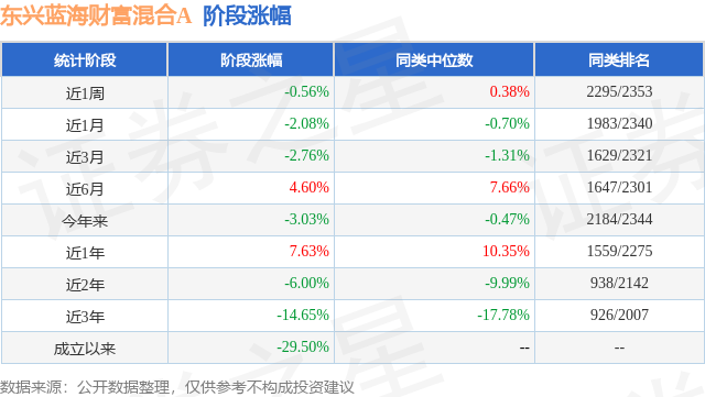从业绩表现来看,东兴蓝海财富混合A基金过去一年净值涨幅为6.94%,在同类基金中排名857/2261,同类基金过去一年净值涨幅中位数为5.1%。而基金过去一年的最大回撤为-14.19%,成立以来的最大回撤为-42.3%。