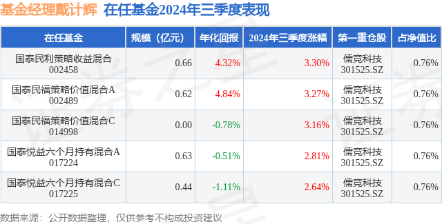 从基金规模来看,国泰民福策略价值混合A基金2024年三季度公布的基金规模为0.62亿元,较上一期规模6264.5万元变化了-56.51万元,环比变化了-0.9%。该基金最新一期资产配置为:股票占净值比23.17%,债券占净值比58.7%,现金占净值比10.39%。从基金持仓来看,该基金当季前十大股票仓位达6.37%,第一大重仓股为儒竞科技(301525),持仓占比为0.76%。
