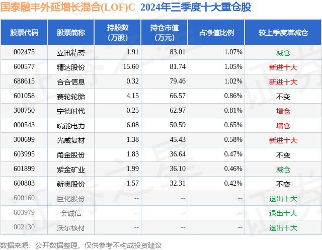 从基金规模来看,国泰融丰外延增长混合(LOF)C基金2024年三季度公布的基金规模为0.02亿元,较上一期规模225.54万元变化了-14.15万元,环比变化了-6.27%。该基金最新一期资产配置为:股票占净值比17.69%,债券占净值比26.05%,现金占净值比56.72%。从基金持仓来看,该基金当季前十大股票仓位达7.39%,第一大重仓股为立讯精密(002475),持仓占比为1.07%。