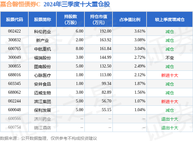 从基金规模来看,嘉合磐恒债券C基金2024年三季度公布的基金规模为0.0亿元,较上一期规模18.95万元变化了5.02万元,环比变化了26.51%。该基金最新一期资产配置为:股票占净值比22.59%,债券占净值比103.43%,现金占净值比6.29%。从基金持仓来看,该基金当季前十大股票仓位达22.6%,第一大重仓股为科伦药业(002422),持仓占比为3.61%。
