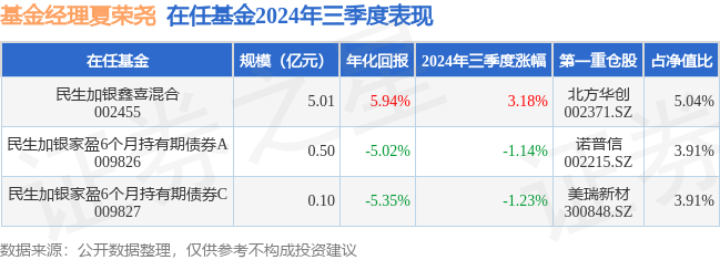 证券之星消息,日前民生加银鑫喜混合基金公布三季报,2024年三季度最新规模5.01亿元,季度净值涨幅为3.18%。