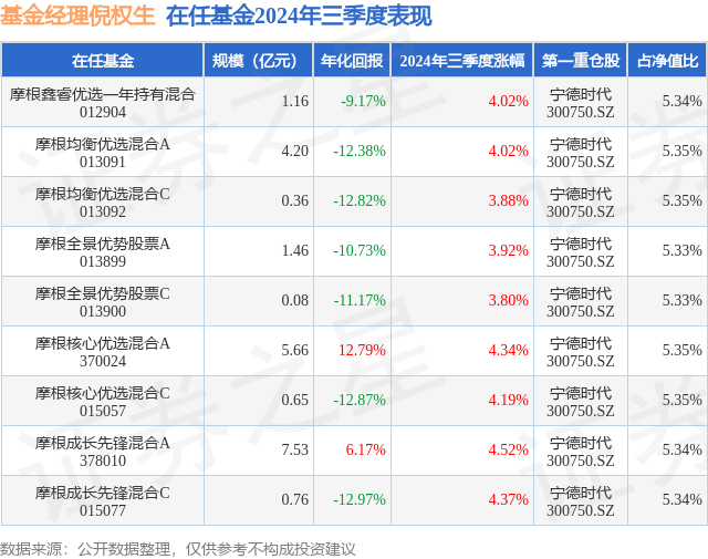 从基金规模来看,摩根成长先锋混合C基金2024年三季度公布的基金规模为0.76亿元,较上一期规模7258.77万元变化了347.4万元,环比变化了4.79%。该基金最新一期资产配置为:股票占净值比84.74%,无债券类资产,现金占净值比16.77%。从基金持仓来看,该基金当季前十大股票仓位达31.22%,第一大重仓股为宁德时代(300750),持仓占比为5.34%。