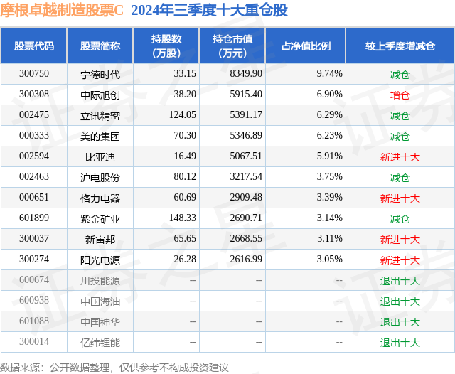 从基金规模来看,摩根卓越制造股票C基金2024年三季度公布的基金规模为0.01亿元,较上一期规模102.58万元变化了28.89万元,环比变化了28.17%。该基金最新一期资产配置为:股票占净值比91.85%,无债券类资产,现金占净值比13.41%。从基金持仓来看,该基金当季前十大股票仓位达51.51%,第一大重仓股为宁德时代(300750),持仓占比为9.74%。