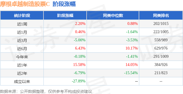 从业绩表现来看,摩根卓越制造股票C基金过去一年净值涨幅为11.7%,在同类基金中排名256/897,同类基金过去一年净值涨幅中位数为6.57%。而基金过去一年的最大回撤为-13.57%,成立以来的最大回撤为-40.62%。