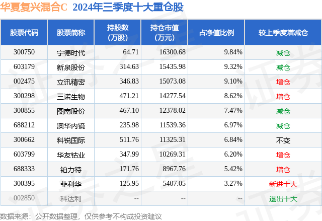 从基金规模来看,华夏复兴混合C基金2024年三季度公布的基金规模为0.1亿元,较上一期规模876.98万元变化了97.88万元,环比变化了11.16%。该基金最新一期资产配置为:股票占净值比91.18%,债券占净值比4.88%,现金占净值比3.22%。从基金持仓来看,该基金当季前十大股票仓位达73.05%,第一大重仓股为宁德时代(300750),持仓占比为9.84%。