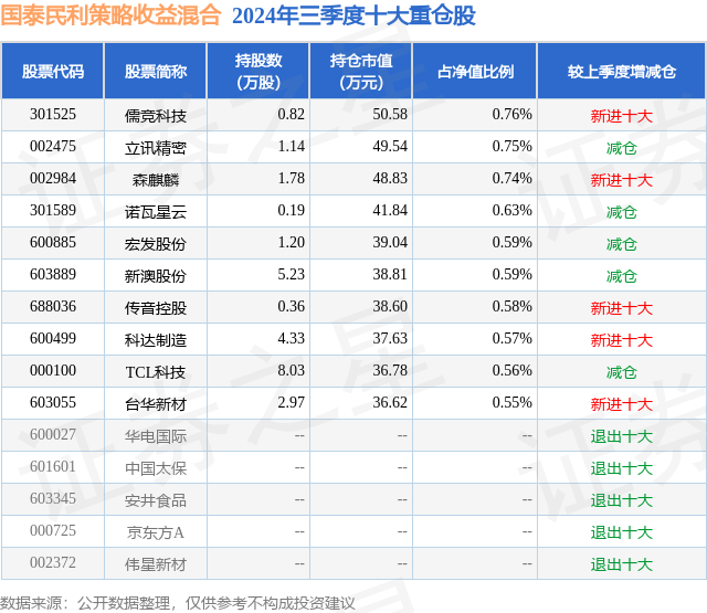 从基金规模来看,国泰民利策略收益混合基金2024年三季度公布的基金规模为0.66亿元,较上一期规模6503.88万元变化了120.55万元,环比变化了1.85%。该基金最新一期资产配置为:股票占净值比23.08%,债券占净值比69.44%,现金占净值比9.23%。从基金持仓来看,该基金当季前十大股票仓位达6.32%,第一大重仓股为儒竞科技(301525),持仓占比为0.76%。