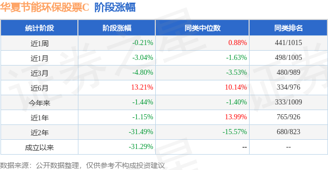 从业绩表现来看,华夏节能环保股票C基金过去一年净值涨幅为0.9%,在同类基金中排名703/897,同类基金过去一年净值涨幅中位数为6.57%。而基金过去一年的最大回撤为-31.24%,成立以来的最大回撤为-54.04%。
