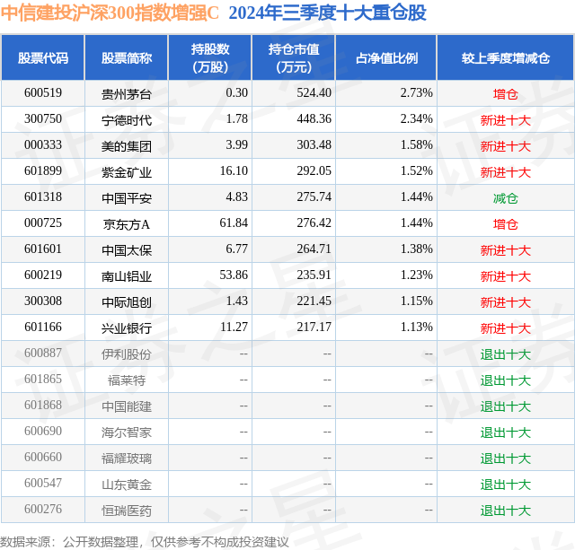 从基金规模来看,中信建投沪深300指数增强C基金2024年三季度公布的基金规模为0.37亿元,较上一期规模5376.56万元变化了-1676.71万元,环比变化了-31.19%。该基金最新一期资产配置为:股票占净值比90.64%,无债券类资产,现金占净值比9.39%。从基金持仓来看,该基金当季前十大股票仓位达15.94%,第一大重仓股为贵州茅台(600519),持仓占比为2.73%。