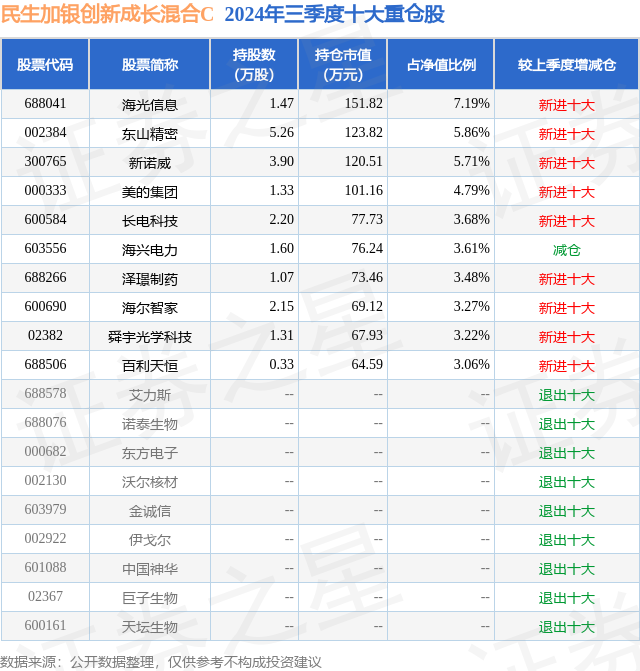 从基金规模来看,民生加银创新成长混合C基金2024年三季度公布的基金规模为0.02亿元,较上一期规模165.8万元变化了17.87万元,环比变化了10.78%。该基金最新一期资产配置为:股票占净值比92.74%,无债券类资产,现金占净值比6.01%。从基金持仓来看,该基金当季前十大股票仓位达43.87%,第一大重仓股为海光信息(688041),持仓占比为7.19%。