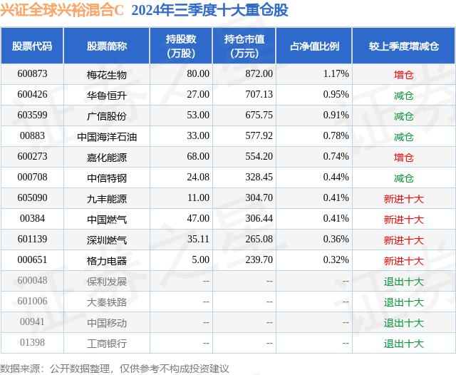 从基金规模来看,兴证全球兴裕混合C基金2024年三季度公布的基金规模为2.85亿元,较上一期规模3.07亿元变化了-2202.32万元,环比变化了-7.17%。该基金最新一期资产配置为:股票占净值比8.8%,债券占净值比93.81%,现金占净值比0.49%。从基金持仓来看,该基金当季前十大股票仓位达6.49%,第一大重仓股为梅花生物(600873),持仓占比为1.17%。