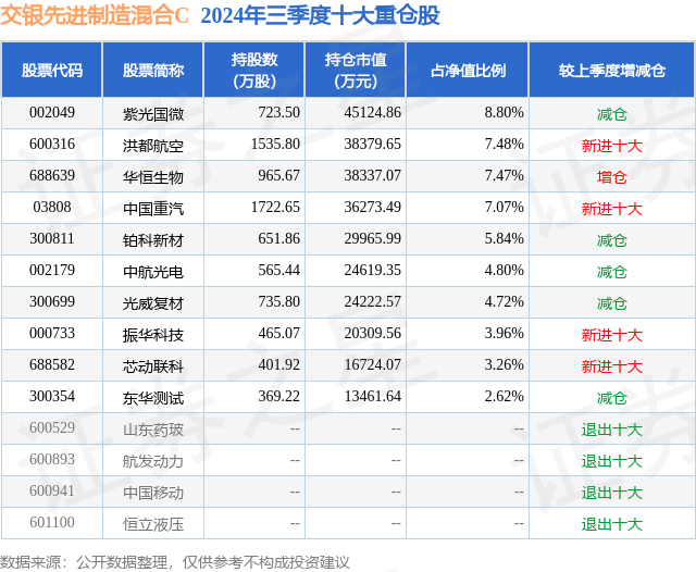 从基金规模来看,交银先进制造混合C基金2024年三季度公布的基金规模为0.37亿元,较上一期规模4689.79万元变化了-945.44万元,环比变化了-20.16%。该基金最新一期资产配置为:股票占净值比78.69%,债券占净值比4.8%,现金占净值比11.02%。从基金持仓来看,该基金当季前十大股票仓位达56.02%,第一大重仓股为紫光国微(002049),持仓占比为8.8%。