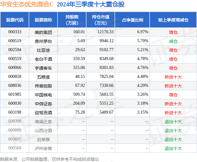 从基金规模来看,华安生态优先混合C基金2024年三季度公布的基金规模为1.46亿元,较上一期规模8995.34万元变化了5615.99万元,环比变化了62.43%。该基金最新一期资产配置为:股票占净值比82.21%,无债券类资产,现金占净值比12.87%。从基金持仓来看,该基金当季前十大股票仓位达45.69%,第一大重仓股为美的集团(000333),持仓占比为6.97%。