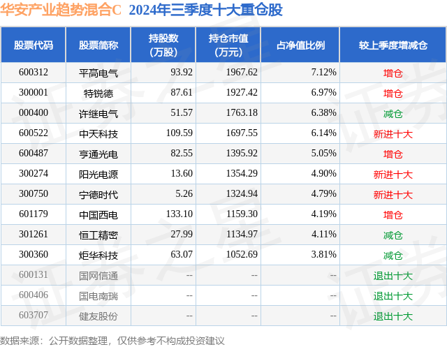 从基金规模来看,华安产业趋势混合C基金2024年三季度公布的基金规模为0.17亿元,较上一期规模1636.91万元变化了63.74万元,环比变化了3.89%。该基金最新一期资产配置为:股票占净值比82.02%,无债券类资产,现金占净值比11.26%。从基金持仓来看,该基金当季前十大股票仓位达53.46%,第一大重仓股为平高电气(600312),持仓占比为7.12%。