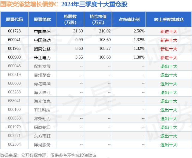 从基金规模来看,国联安添益增长债券C基金2024年三季度公布的基金规模为0.0亿元,较上一期规模0.52万元变化了-0.0万元,环比变化了-0.69%。该基金最新一期资产配置为:股票占净值比6.51%,债券占净值比81.02%,现金占净值比0.51%。从基金持仓来看,该基金当季前十大股票仓位达6.5%,第一大重仓股为中国电信(601728),持仓占比为2.56%。