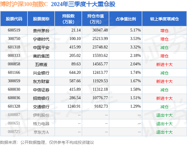 从基金规模来看,博时沪深300指数C基金2024年三季度公布的基金规模为18.95亿元,较上一期规模15.71亿元变化了3.24亿元,环比变化了20.62%。该基金最新一期资产配置为:股票占净值比94.69%,无债券类资产,现金占净值比5.55%。从基金持仓来看,该基金当季前十大股票仓位达24.03%,第一大重仓股为贵州茅台(600519),持仓占比为5.17%。