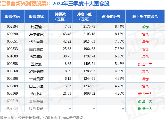 从基金规模来看,汇添富新兴消费股票C基金2024年三季度公布的基金规模为0.01亿元,较上一期规模67.82万元变化了10.26万元,环比变化了15.13%。该基金最新一期资产配置为:股票占净值比89.86%,无债券类资产,现金占净值比6.33%。从基金持仓来看,该基金当季前十大股票仓位达63.35%,第一大重仓股为比亚迪(002594),持仓占比为8.44%。