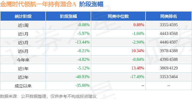 从业绩表现来看,金鹰时代领航一年持有混合A基金过去一年净值涨幅为2.17%,在同类基金中排名2485/3979,同类基金过去一年净值涨幅中位数为5.4%。而基金过去一年的最大回撤为-27.36%,成立以来的最大回撤为-46.71%。