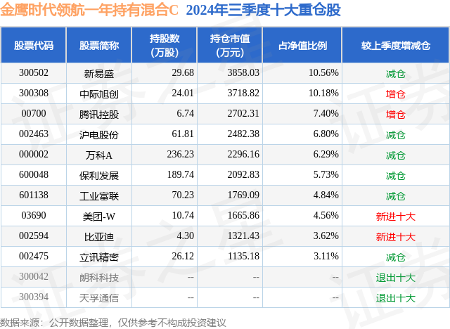 从基金规模来看,金鹰时代领航一年持有混合C基金2024年三季度公布的基金规模为2.45亿元,较上一期规模2.31亿元变化了1448.64万元,环比变化了6.28%。该基金最新一期资产配置为:股票占净值比90.07%,无债券类资产,现金占净值比0.28%。从基金持仓来看,该基金当季前十大股票仓位达63.09%,第一大重仓股为新易盛(300502),持仓占比为10.56%。