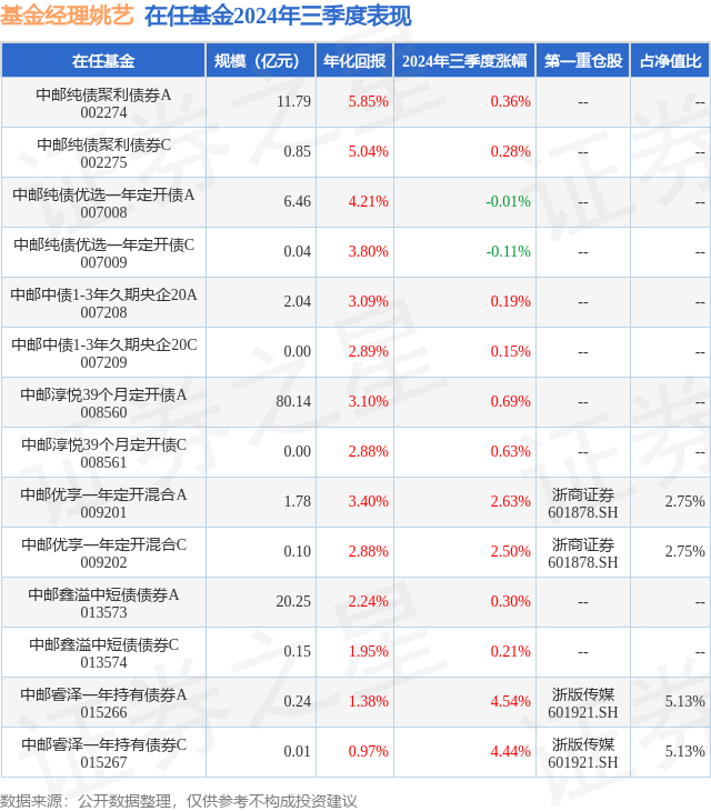 从基金规模来看,中邮睿泽一年持有债券A基金2024年三季度公布的基金规模为0.24亿元,较上一期规模2716.07万元变化了-353.69万元,环比变化了-13.02%。该基金最新一期资产配置为:股票占净值比20.08%,债券占净值比91.91%,现金占净值比1.19%。从基金持仓来看,该基金当季前十大股票仓位达20.09%,第一大重仓股为浙版传媒(601921),持仓占比为5.13%。