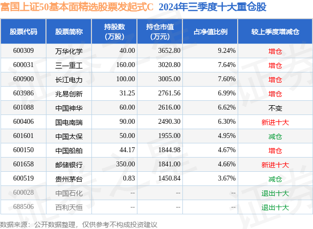 从基金规模来看,富国上证50基本面精选股票发起式C基金2024年三季度公布的基金规模为1.54亿元,较上一期规模8881.26万元变化了6558.02万元,环比变化了73.84%。该基金最新一期资产配置为:股票占净值比92.14%,无债券类资产,现金占净值比8.51%。从基金持仓来看,该基金当季前十大股票仓位达62.34%,第一大重仓股为万华化学(600309),持仓占比为9.24%。