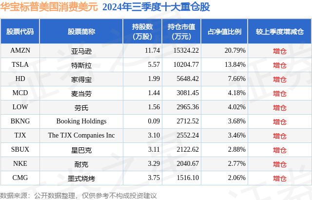从基金规模来看,华宝标普美国消费美元基金2024年三季度公布的基金规模为5.4亿元,较上一期规模3.77亿元变化了1.63亿元,环比变化了43.32%。该基金最新一期资产配置为:股票占净值比94.34%,无债券类资产,现金占净值比6.84%。从基金持仓来看,该基金当季前十大股票仓位达65.34%,第一大重仓股为亚马逊(AMZN),持仓占比为20.79%。