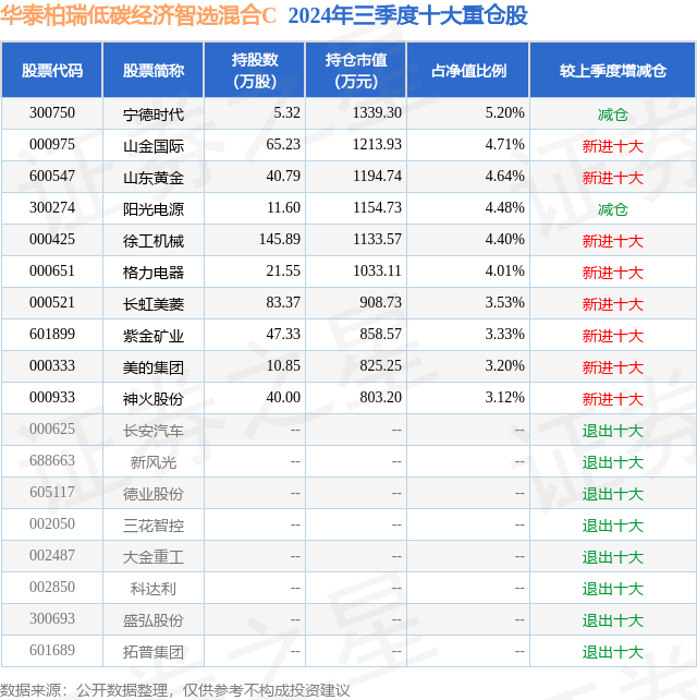 从基金规模来看,华泰柏瑞低碳经济智选混合C基金2024年三季度公布的基金规模为0.38亿元,较上一期规模3658.14万元变化了178.46万元,环比变化了4.88%。该基金最新一期资产配置为:股票占净值比88.36%,无债券类资产,现金占净值比11.91%。从基金持仓来看,该基金当季前十大股票仓位达40.62%,第一大重仓股为宁德时代(300750),持仓占比为5.2%。