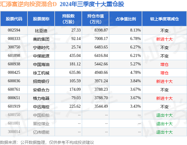从基金规模来看,汇添富逆向投资混合D基金2024年三季度公布的基金规模为0.7亿元,较上一期规模4399.29万元变化了2611.58万元,环比变化了59.36%。该基金最新一期资产配置为:股票占净值比90.6%,无债券类资产,现金占净值比9.75%。从基金持仓来看,该基金当季前十大股票仓位达52.05%,第一大重仓股为比亚迪(002594),持仓占比为8.13%。