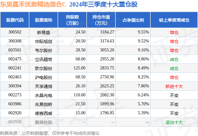 从基金规模来看,东吴嘉禾优势精选混合C基金2024年三季度公布的基金规模为0.24亿元,较上一期规模1519.64万元变化了882.1万元,环比变化了58.05%。该基金最新一期资产配置为:股票占净值比93.88%,无债券类资产,现金占净值比5.75%。从基金持仓来看,该基金当季前十大股票仓位达79.02%,第一大重仓股为新易盛(300502),持仓占比为9.55%。