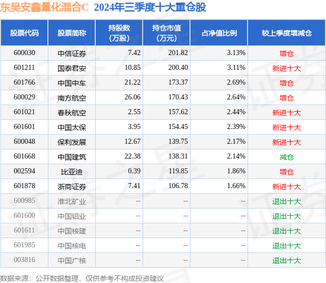 从基金规模来看,东吴安鑫量化混合C基金2024年三季度公布的基金规模为0.0亿元,较上一期规模40.95万元变化了0.87万元,环比变化了2.12%。该基金最新一期资产配置为:股票占净值比41.36%,债券占净值比36.15%,现金占净值比4.87%。从基金持仓来看,该基金当季前十大股票仓位达24.23%,第一大重仓股为中信证券(600030),持仓占比为3.13%。