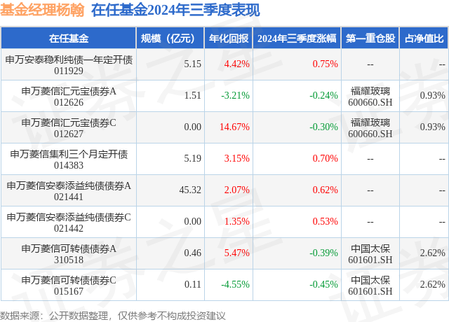 申万菱信可转债债券C现任基金经理为杨翰 褚一凡。其中在任基金经理杨翰已从业4年又170天,2023年7月10日正式接手管理申万菱信可转债债券C,任职期间累计回报为-3.15%。目前还管理着8只基金产品(包括A类和C类),其中本季度表现最佳的基金为申万安泰稳利纯债一年定开债(011929),季度净值涨幅为0.75%。