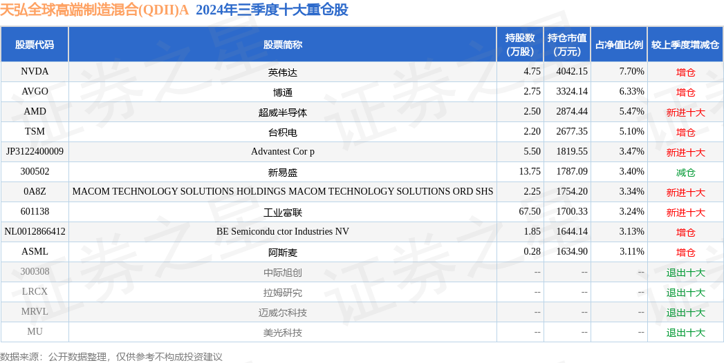 从基金规模来看,天弘全球高端制造混合(QDII)A基金2024年三季度公布的基金规模为1.83亿元,较上一期规模1.02亿元变化了8025.5万元,环比变化了78.37%。该基金最新一期资产配置为:股票占净值比86.98%,债券占净值比4.85%,现金占净值比4.65%。从基金持仓来看,该基金当季前十大股票仓位达44.29%,第一大重仓股为英伟达(NVDA),持仓占比为7.7%。