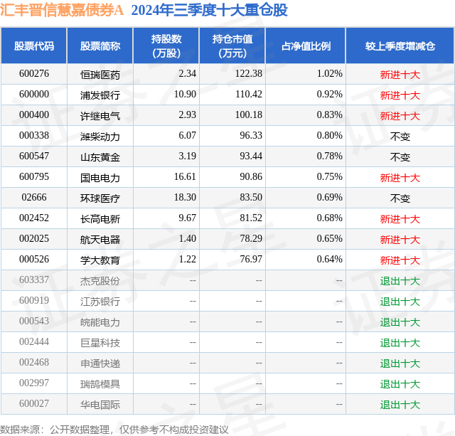 从基金规模来看,汇丰晋信慧嘉债券A基金2024年三季度公布的基金规模为0.95亿元,较上一期规模1.09亿元变化了-1335.89万元,环比变化了-12.3%。该基金最新一期资产配置为:股票占净值比11.41%,债券占净值比72.98%,现金占净值比4.35%。从基金持仓来看,该基金当季前十大股票仓位达7.76%,第一大重仓股为恒瑞医药(600276),持仓占比为1.02%。
