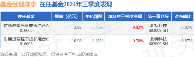 从基金规模来看,财通资管臻享成长混合A基金2024年三季度公布的基金规模为3.92亿元,较上一期规模3.74亿元变化了1835.11万元,环比变化了4.91%。该基金最新一期资产配置为:股票占净值比93.52%,债券占净值比0.1%,现金占净值比5.06%。从基金持仓来看,该基金当季前十大股票仓位达54.57%,第一大重仓股为北特科技(603009),持仓占比为8.87%。