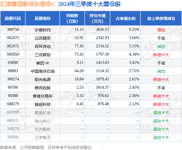 从基金规模来看,汇添富创新成长混合C基金2024年三季度公布的基金规模为0.51亿元,较上一期规模4674.52万元变化了471.03万元,环比变化了10.08%。该基金最新一期资产配置为:股票占净值比84.94%,无债券类资产,现金占净值比14.66%。从基金持仓来看,该基金当季前十大股票仓位达40.02%,第一大重仓股为宁德时代(300750),持仓占比为9.21%。