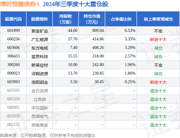 从基金规模来看,博时恒耀债券A基金2024年三季度公布的基金规模为1.07亿元,较上一期规模1.15亿元变化了-744.02万元,环比变化了-6.49%。该基金最新一期资产配置为:股票占净值比19.8%,债券占净值比80.17%,现金占净值比2.13%。从基金持仓来看,该基金当季前十大股票仓位达19.81%,第一大重仓股为紫金矿业(601899),持仓占比为6.53%。