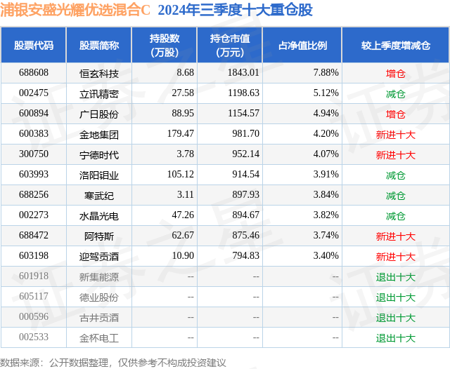 从基金规模来看,浦银安盛光耀优选混合C基金2024年三季度公布的基金规模为1.65亿元,较上一期规模1.56亿元变化了938.01万元,环比变化了6.03%。该基金最新一期资产配置为:股票占净值比85.66%,无债券类资产,现金占净值比16.44%。从基金持仓来看,该基金当季前十大股票仓位达44.92%,第一大重仓股为恒玄科技(688608),持仓占比为7.88%。