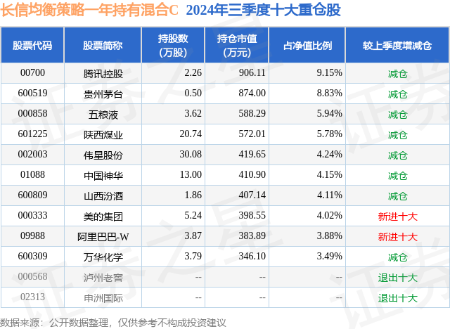 从基金规模来看,长信均衡策略一年持有混合C基金2024年三季度公布的基金规模为0.57亿元,较上一期规模5528.15万元变化了124.39万元,环比变化了2.25%。该基金最新一期资产配置为:股票占净值比91.72%,债券占净值比6.31%,现金占净值比1.8%。从基金持仓来看,该基金当季前十大股票仓位达53.59%,第一大重仓股为腾讯控股(00700),持仓占比为9.15%。