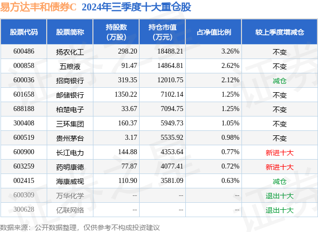 从基金规模来看,易方达丰和债券C基金2024年三季度公布的基金规模为1.07亿元,较上一期规模1.28亿元变化了-2096.75万元,环比变化了-16.36%。该基金最新一期资产配置为:股票占净值比17.83%,债券占净值比112.04%,现金占净值比0.97%。从基金持仓来看,该基金当季前十大股票仓位达14.65%,第一大重仓股为扬农化工(600486),持仓占比为3.26%。