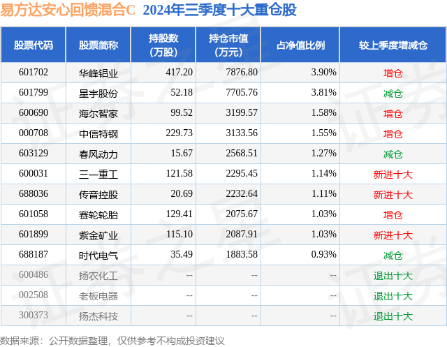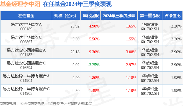 从基金规模来看,易方达安心回馈混合C基金2024年三季度公布的基金规模为0.02亿元,较上一期规模139.15万元变化了98.66万元,环比变化了70.91%。该基金最新一期资产配置为:股票占净值比27.86%,债券占净值比96.06%,现金占净值比0.39%。从基金持仓来看,该基金当季前十大股票仓位达17.35%,第一大重仓股为华峰铝业(601702),持仓占比为3.9%。