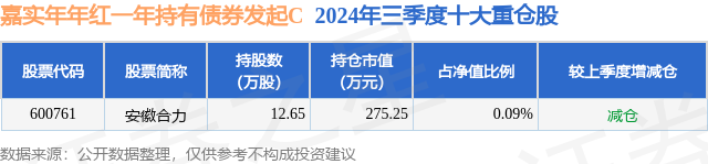 从基金规模来看,嘉实年年红一年持有债券发起C基金2024年三季度公布的基金规模为10.62亿元,较上一期规模9.97亿元变化了6479.53万元,环比变化了6.5%。该基金最新一期资产配置为:股票占净值比0.09%,债券占净值比99.32%,现金占净值比0.13%。从基金持仓来看,该基金当季前十大股票仓位达0.09%,第一大重仓股为安徽合力(600761),持仓占比为0.09%。