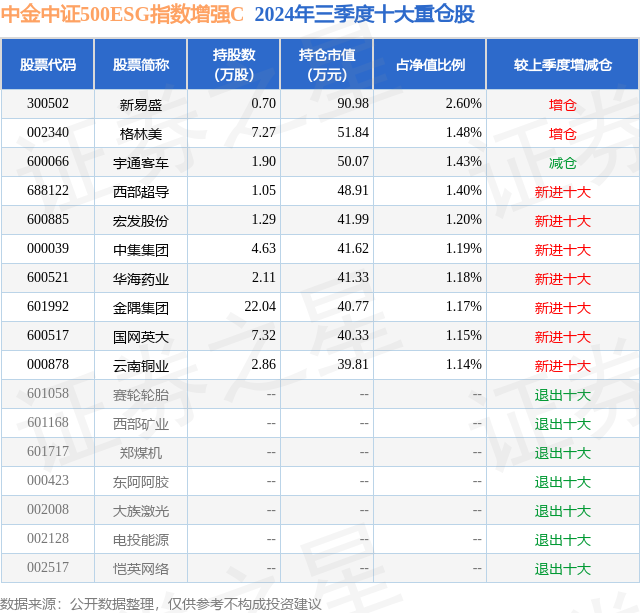 从基金规模来看,中金中证500ESG指数增强C基金2024年三季度公布的基金规模为0.12亿元,较上一期规模1104.89万元变化了141.98万元,环比变化了12.85%。该基金最新一期资产配置为:股票占净值比94.49%,债券占净值比5.22%,现金占净值比0.61%。从基金持仓来看,该基金当季前十大股票仓位达13.94%,第一大重仓股为新易盛(300502),持仓占比为2.6%。